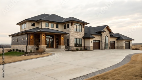 Fototapeta premium A grand modern luxury house with a beautiful stone and stucco exterior stands proudly, featuring a long driveway in a vast open landscape.
