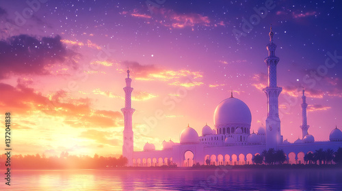 Fototapeta premium A grand mosque silhouette against a vibrant sunset sky with water reflection and starry night above