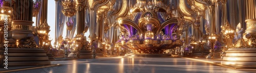 Fototapeta premium A grand, opulent interior featuring golden pillars, intricate designs, and purple accents, creating a majestic and luxurious ambiance.