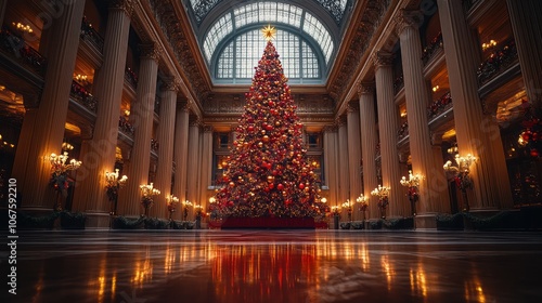 Obraz premium A grand, ornate Christmas tree stands tall in a spacious hall, illuminated by...
