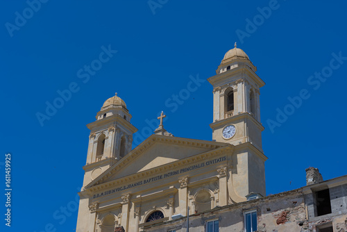 Fototapeta premium A grand, ornate church with two prominent bell towers and a clock on one,...