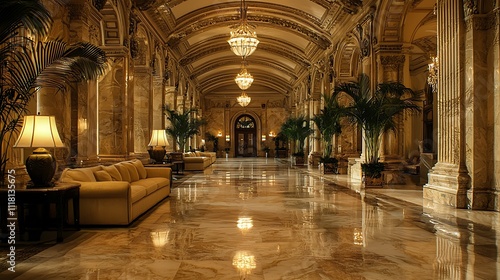 © Dwina, Fototapeta premium A grand, ornate hallway with marble floors, columns, and chandeliers.