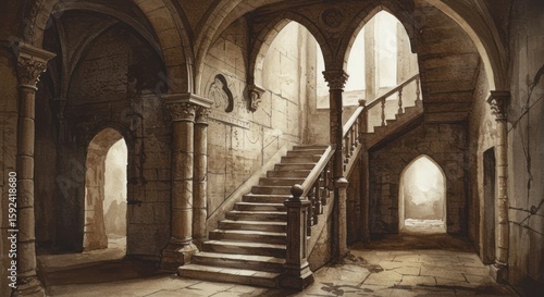 Fototapeta premium A grand stone staircase ascends within an ancient, arched hallway.
