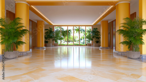 Fototapeta premium A grand, sunlit lobby featuring gleaming marble floors and vibrant yellow columns.