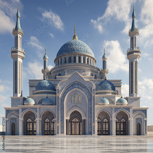 Fototapeta premium A grand white mosque with blue and gold details, featuring multiple domes and...
