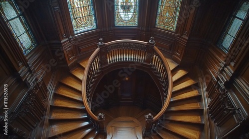 © MUMTAZ, Fototapeta premium A grand wooden staircase with stained glass windows, showcasing intricate craftsmanship.