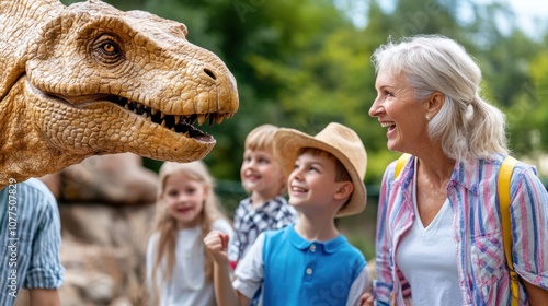 Obraz premium A grandmother shares a smile with children as they gaze in awe at a realistic dinosaur model in a vibrant park setting filled with greenery and sunlight