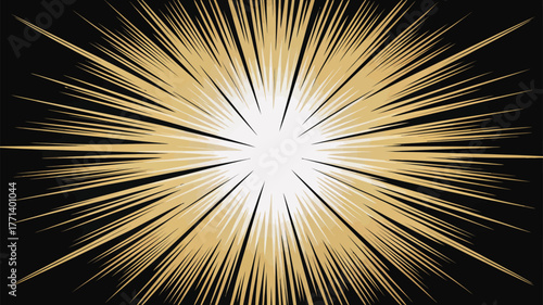 © Rasheed, Obraz premium A graphic illustration of golden rays emanating from a central white point on black background