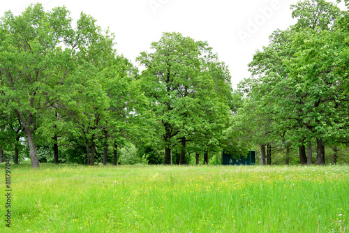 © Irina, Fototapeta premium a grassland with green oak trees and wooden pavilion