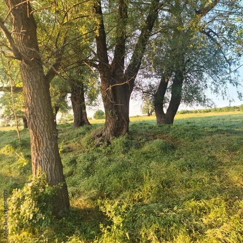 © parpalac, Fototapeta premium A grassy area with trees and bushes