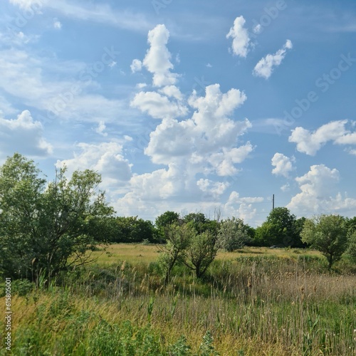 © parpalac, Obraz premium A grassy field with trees and blue sky
