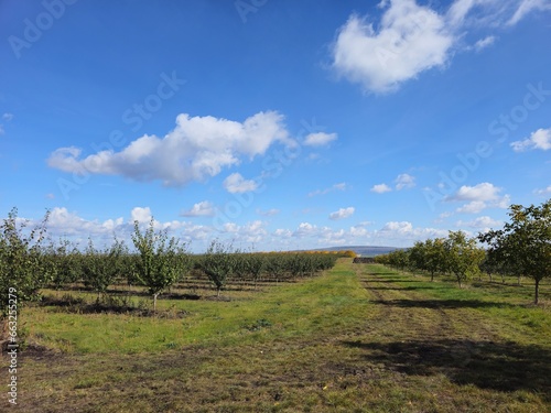 © parpalac, Fototapeta premium A grassy field with trees and blue sky