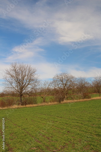 © parpalac, Fototapeta premium A grassy field with trees and blue sky