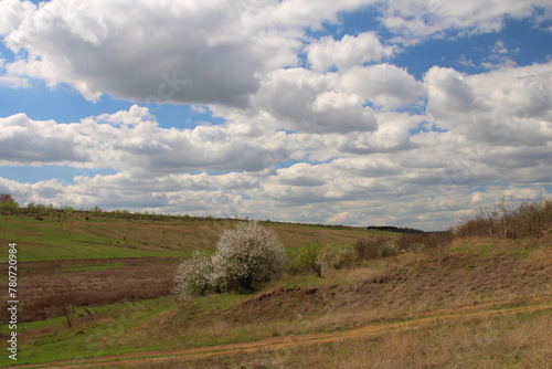 © parpalac, Fototapeta premium A grassy field with trees and blue sky
