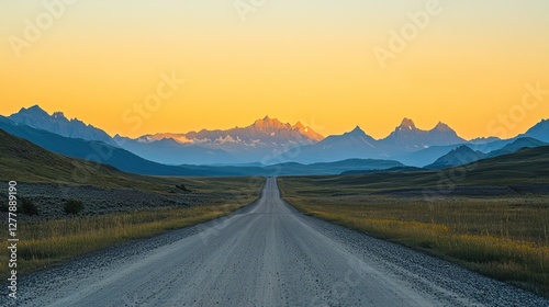 Fototapeta premium A gravel road leads towards mountains under a colorful sky