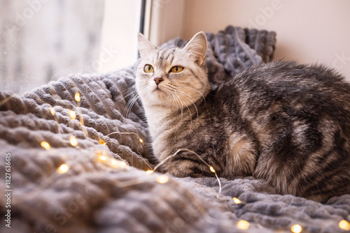 © ketrin, Obraz premium A gray, beautiful British shorthair cat on a blanket in a home environment with bokeh