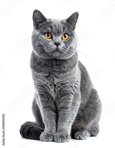 © Arif, Fototapeta premium A gray cat with yellow eyes sits on a white background