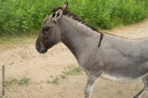 Fototapeta premium A gray donkey walks on the sand