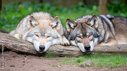 © lililia, Fototapeta premium A gray-furred wolf with a white belly gazes at the camera while lying near a tree trunk, accompanied by another wolf, both enjoying their serene habitat