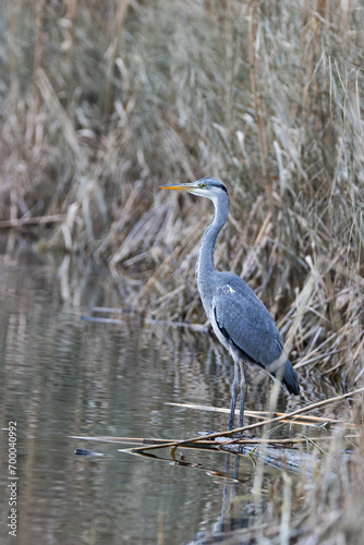 © Nicolette Wollentin, Naklejka premium A gray heron (Ardea cinerea) sits on the edge of a lake