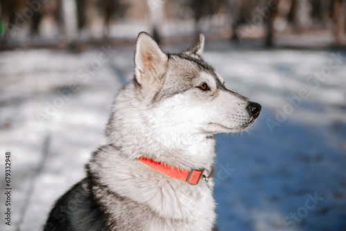 Naklejka premium A gray husky dog that looks like a wolf in the forest in winter.