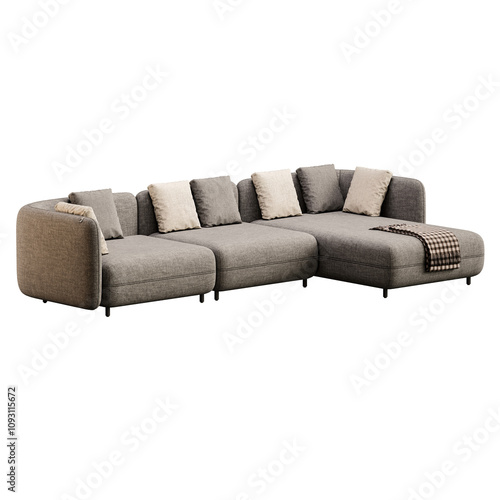 © oybekostanov, Obraz premium A gray sectional sofa with pillows and a blanket on it