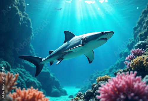 Fototapeta premium A gray shark swimming in a blue ocean with colorful rocks and coral...