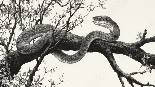 © Elbowpain, Obraz premium A Gray Snake Rests Peacefully On A Branch In A Tree