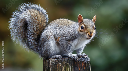 © mr Wajed, Obraz premium A gray squirrel covered in snow sitting on a wooden post outdoors