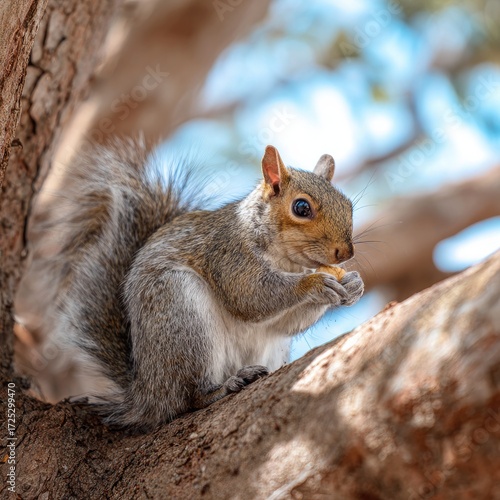 © lampu, Fototapeta premium A gray squirrel sits perched on a tree branch eating