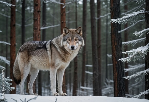 Naklejka premium A gray wolf stands alert in a snowy forest
