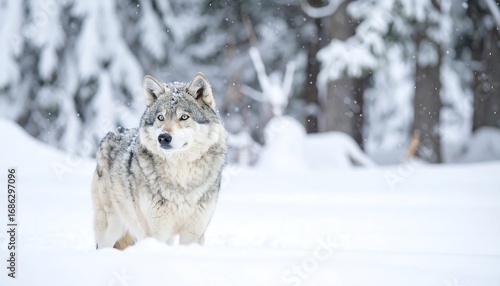 Naklejka premium A gray wolf stands alert in a snowy forest, showcasing winter's beauty.