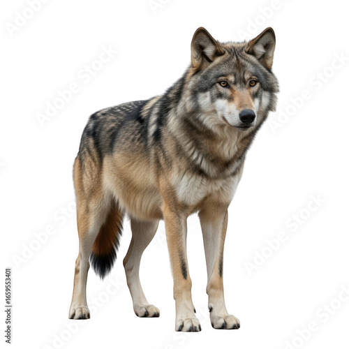 © Sekendar, Fototapeta premium A gray wolf stands alert on a transparent background