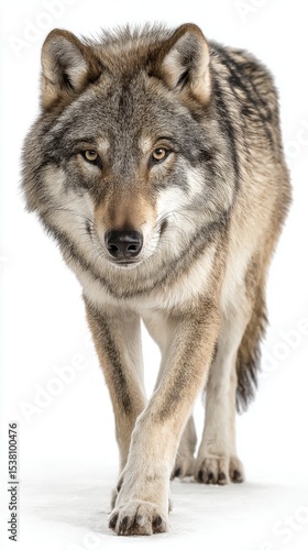 © 王二小, Fototapeta premium A gray wolf with a thick fur coat walking forward against a white background.