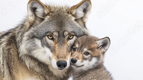 © Aashutosh Pandit, Fototapeta premium a gray wolf with its cub against a white background