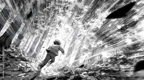 © 88888, Obraz premium A grayscale illustration of a person running through a forest, with dynamic lines