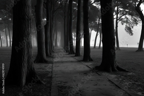 © Stay, Naklejka premium A grayscale path, lined with trees, leads into a misty forest
