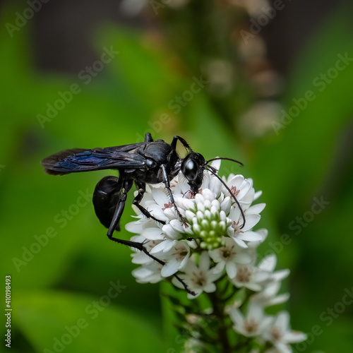 © KSzen, Fototapeta premium A Great Black Wasp (Sphex pensylvanicus) feeding on a Gooseneck plant flower blossom.
