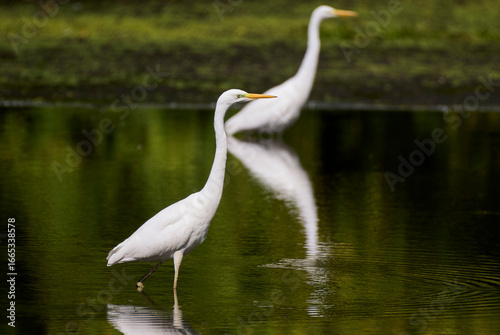 © Николай Мороз, Naklejka premium A great egret hunts on the lake.