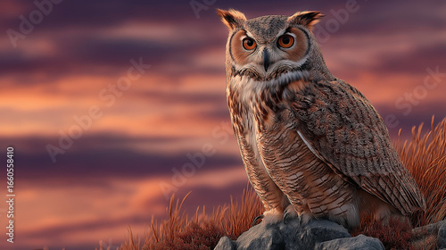 Obraz premium A great horned owl perched on a cliff edge during sunset, vibrant orange and purple sky, dramatic lighting, detailed feathers, ultra-realistic, 8k resolution