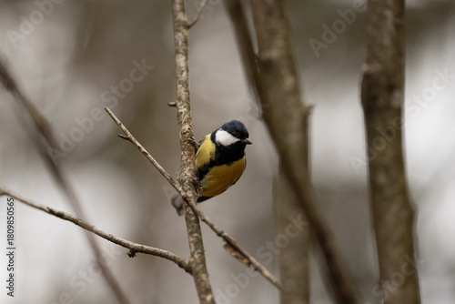 © honey_paws, Fototapeta premium A Great Tit, having black, white, and yellow feathers, rests on a slender tree branch, glancing downwards with a blurred outdoor forest background
