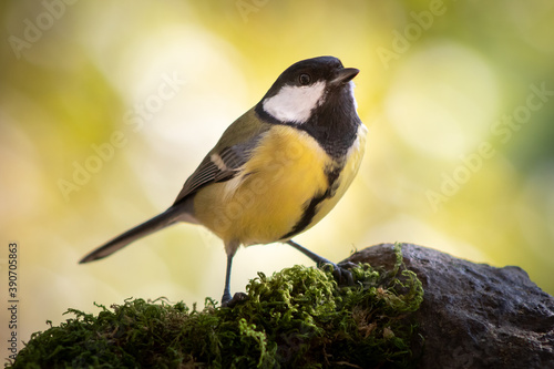 © iabegega, Obraz premium A great tit is perched on the rocks attentive to everything that happens around it. These birds are not very trusting.