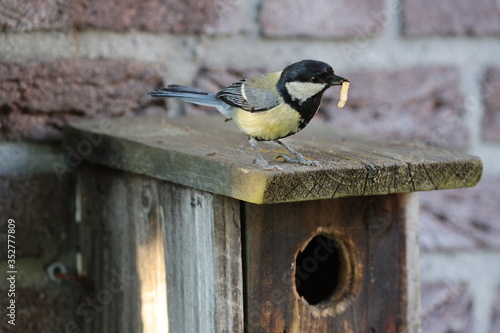 © Jose, Fototapeta premium A great tit on top of a bird cage with a worm in its mouth.