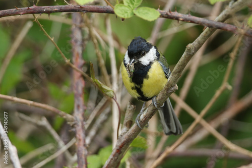Fototapeta premium A Great Tit, Parus major, perched on a branch with a Caterpillar in its beak which it is going to feed to its babies in a nest nearby.
