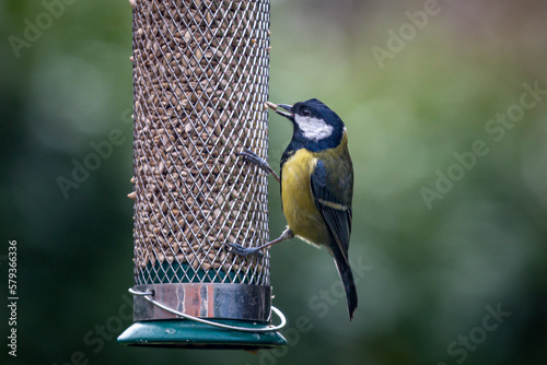 © lemanieh, Naklejka premium A great tit with a sunflower seed in its mouth, with a shallow depth of field