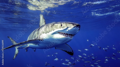 Fototapeta premium A great white shark cruising through the ocean depths, surrounded by small fish.