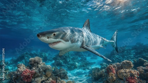 Obraz premium A great white shark glides through crystal clear tropical waters, showcasing its powerful body and sharp teeth. Colorful coral reefs provide a stunning backdrop for this underwater moment.