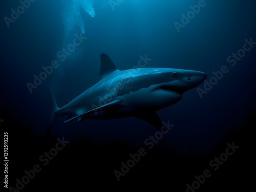 Fototapeta premium A Great White Shark Gliding Through a Dark Ocean, Surrounded by the Glow of...