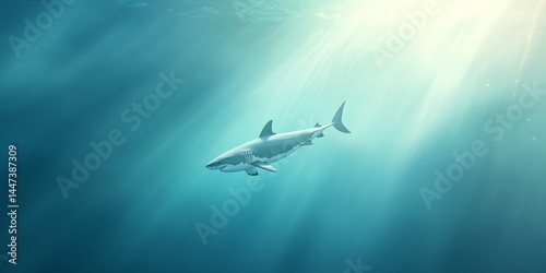 Fototapeta premium A great white shark gracefully swims through the clear ocean waters, illuminated by soft sunlight filtering through the surface.