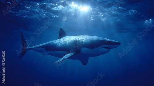 Fototapeta premium A Great White Shark Silhouetted Against the Sunlit Ocean